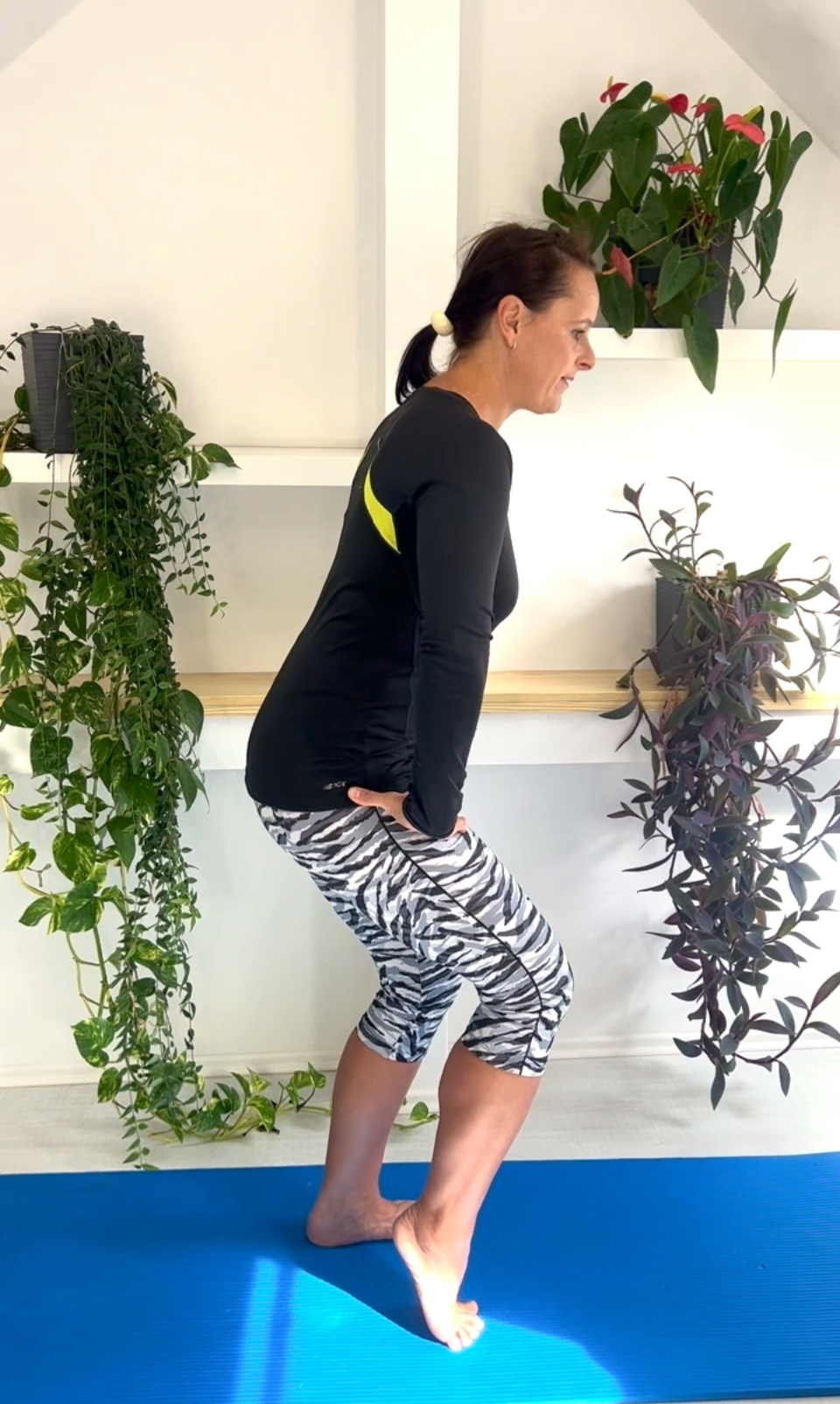 A teprve nyní můžeme začít nadzvedávat střídavě chodidla na špičky. Že to není tak jednoduché? Ne, opravdu není a pokud ještě používáte brániční dech, je to těžší cvik. Ale co je na tom skvělé je fakt, že veškerá síla jde opravdu do stehen, které tak velmi efektivně posilujete. Žádný jiný sval cvik nekompenzuje, nic jiného vás tedy následující den nebude bolet. A co je také velmi důležité, je správné nastavení trupu. Často nás bolí bedra, která ale souvisí s pevným trupem, ale ta při tomto cviku také sekundárně aktivujete :)